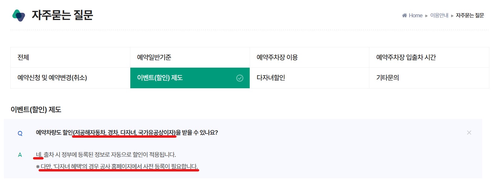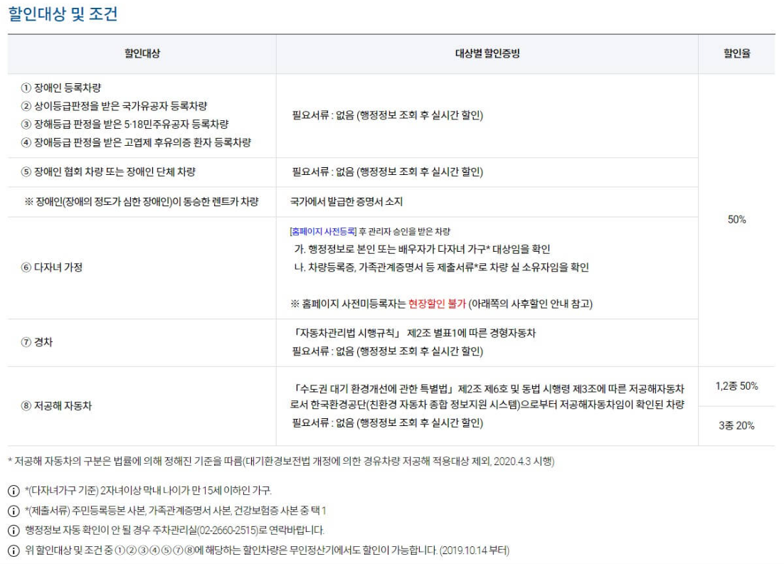 단, 정부에 등록된 차량(경차, 저공해, 국가유공상이자 등) 및 공사 홈페이지에 다자녀 사전 등록을 마친 차량은 자동 할인이 가능하니 참고하시면 되겠습니다.