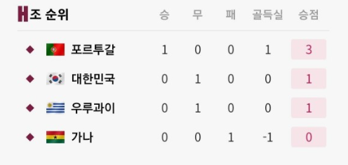 대한민국은 이제 포르투갈과의 경기가 남은 상태입니다.