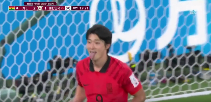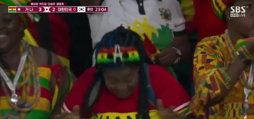 하지만 가나의 쿠두스 선수가 크로스를 골로 만들었고, 대한민국 가나는 2:3이 되었습니다.