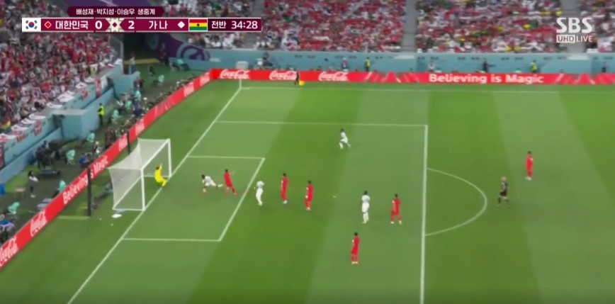 조금 후인 전반전 34분에 가나의 어이없는 추가골이 터졌습니다. 모하메드 쿠두스 선수의 골이었습니다.