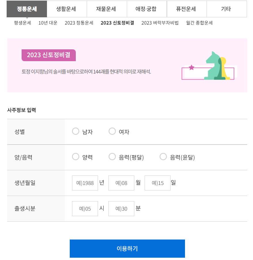 이 중 2023년 신토정비결에서 정통운세, 생활운세, 애정/궁합운세까지 원하는 항목별로 신년 운세를 무료로 확인해볼 수 있습니다 :)