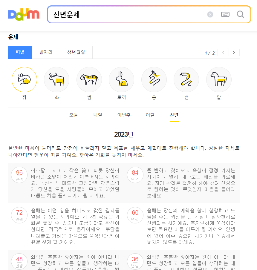 신년운세를 검색하고 하단으로 스크롤을 내리면 아래와 같은 화면을 통해 운세를 볼 수 있습니다.